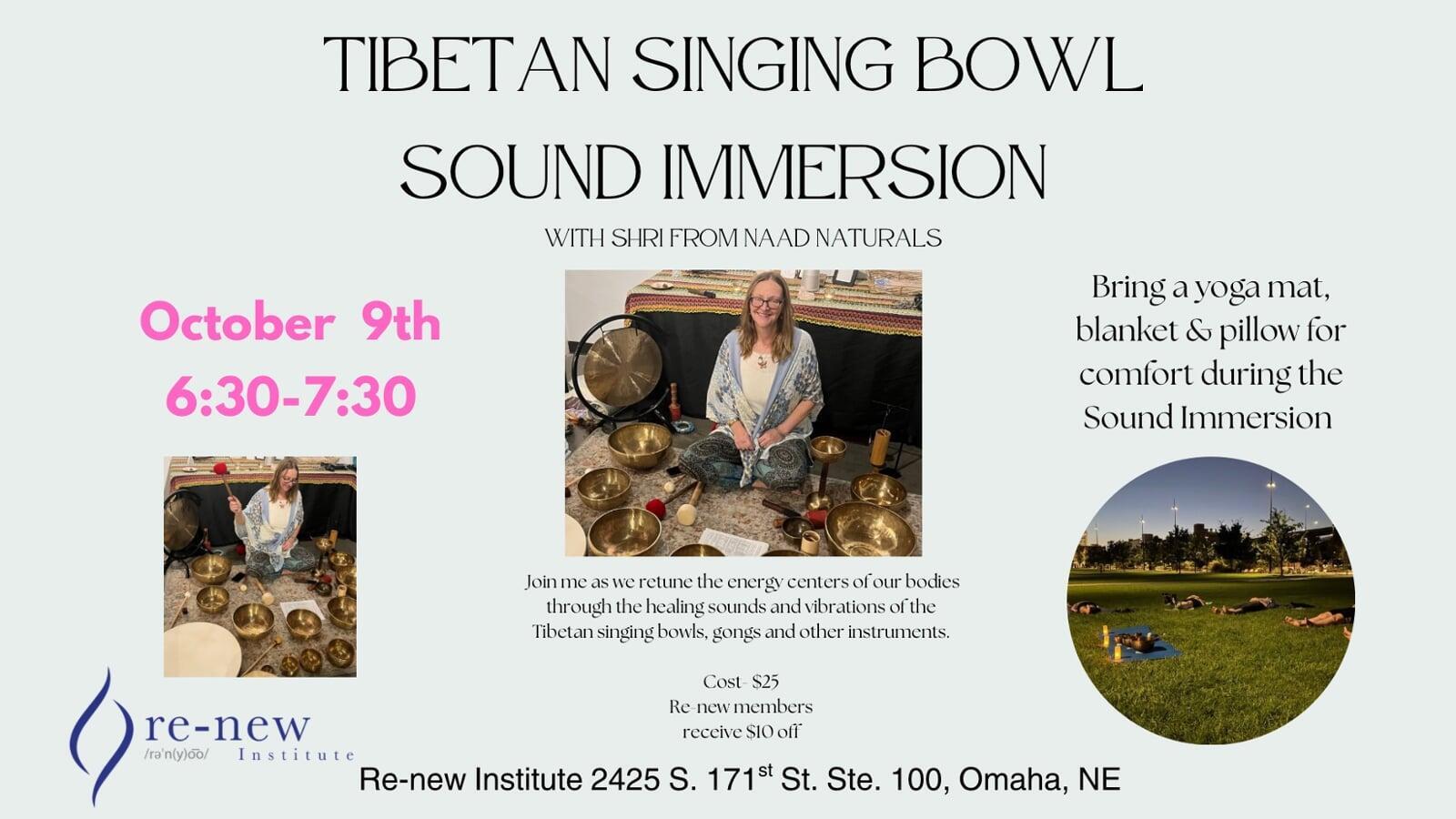 Join us for a restorative evening in the brand-new Re-New Energy Studio with Sheri for Sound Immersion on Wednesday, October 9th and October 16th from 6:30–7:30 PM.